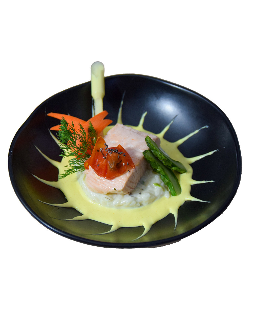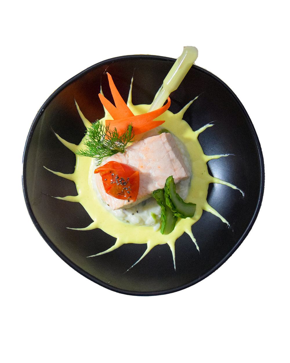Ingrédients : Saumon 40%, riz, parmesan, CREME, asperges, échalotes, VIN BLANC, safran 0.5%, fumet de poisson, carottes, oignons, thym, laurier, sel, poivre