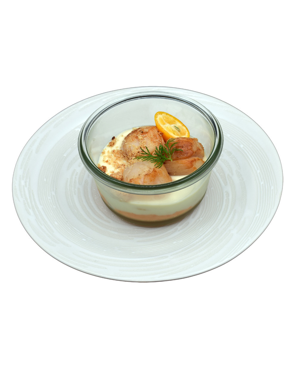 Ingrédients : Saint-Jacques 40%,patates douces20%, BEURRE, farine, miel 2%, orange 0.5% échalotes, crème 35% matière grasse, FARINE, vin blanc kumquat, aneth, BEURRE, poudre de noisette, sel, poivre.