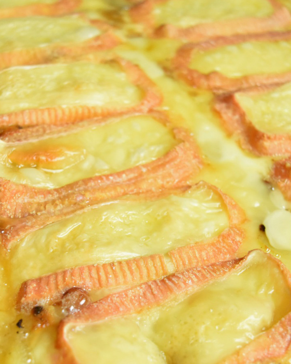 Ingrédients : pomme de terre, lardons, REBLOCHON, oignons, VIN blanc, creme, farine, BEURRE, emmental et comté.
